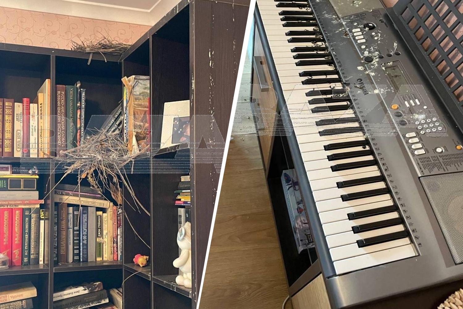 Голуби соорудили гнездо на книжном шкафу и повредили синтезатор