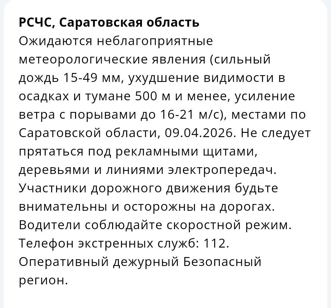 Региональное управление РСЧС распространило предупреждение о шторме в Саратовской области на 9 апреля.