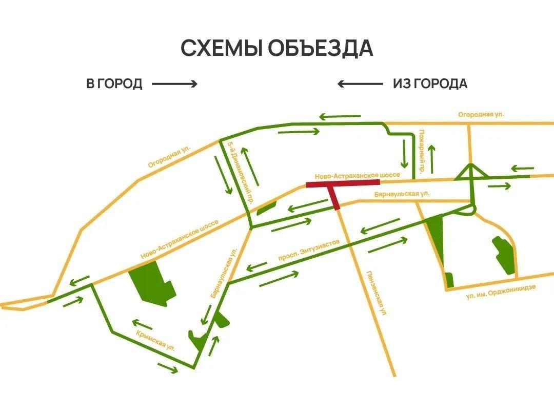 Карта с указанием закрытого отрезка Ново-Астраханского шоссе и путей объезда